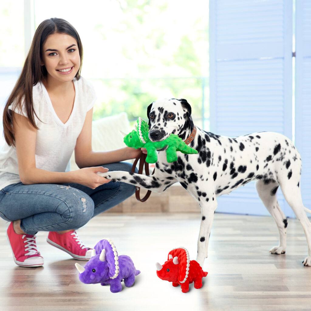 Make playtime more fun! Just Qunseen’s squeaky pet toys include adorable colorful triceratops and pig toys, suitable for all dog breeds and especially popular with small to medium-sized dogs.
