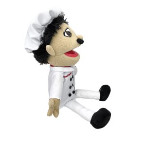 Complete with chef’s hat, mustache, and classic white chef’s uniform, this puppet stands out as a unique culinary character.
