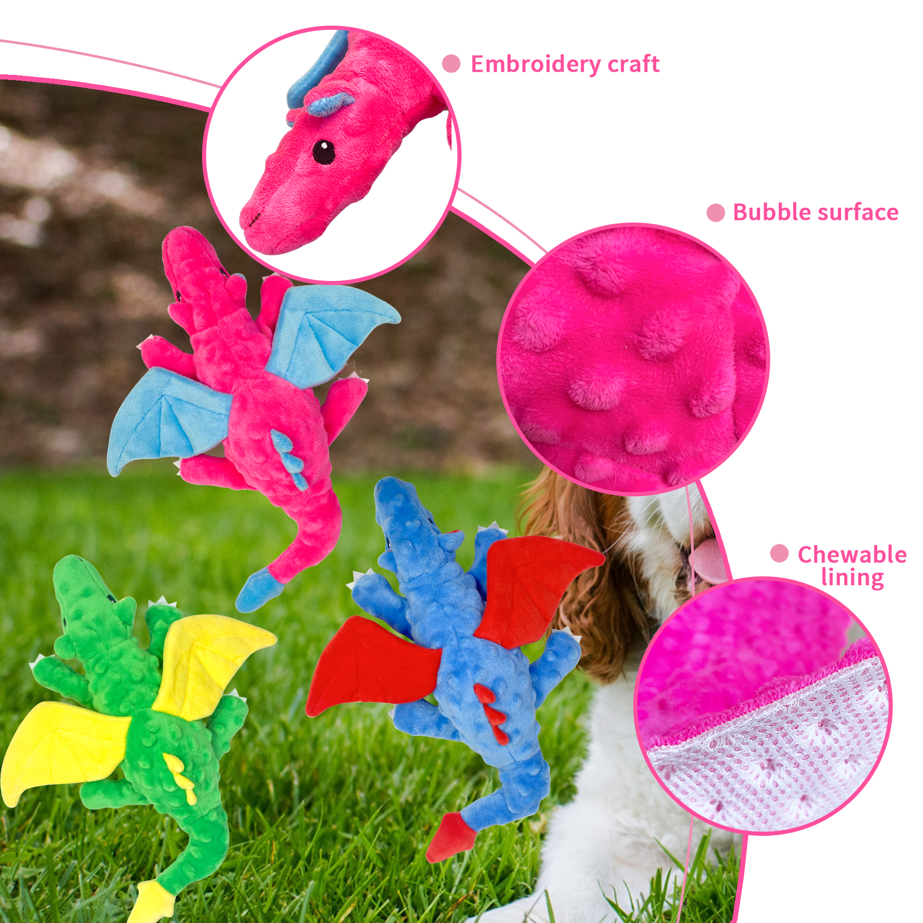 The Colorful Flying Dragon Set features a built-in squeaker that stimulates your dog’s hunting instincts and captures their attention. Designed specifically for dogs with strong chewing power.